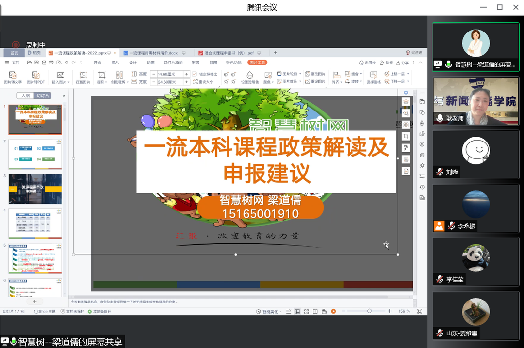 线上举行一流本科政策解读及申报建议讲座,主讲人为智慧树网的梁道儒,参会人员为青大文传学院部分老师。