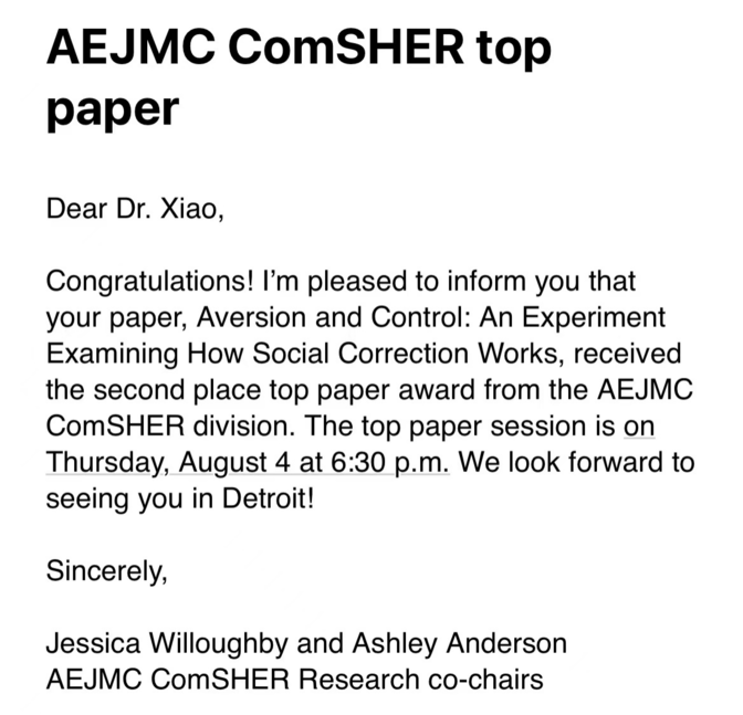 教师肖喜珠获得新闻与大众传播教育协会(AEJMC)2022年最佳论文奖(Top Paper Awardees)二等奖。获奖论文的题目为《厌恶与控制:一个研究社会矫正如何运作的实验》(Aversion and Control:An Experiment Examining How Social Correction Works)。该研究基于实验考察了如何纠正新冠不实信息。