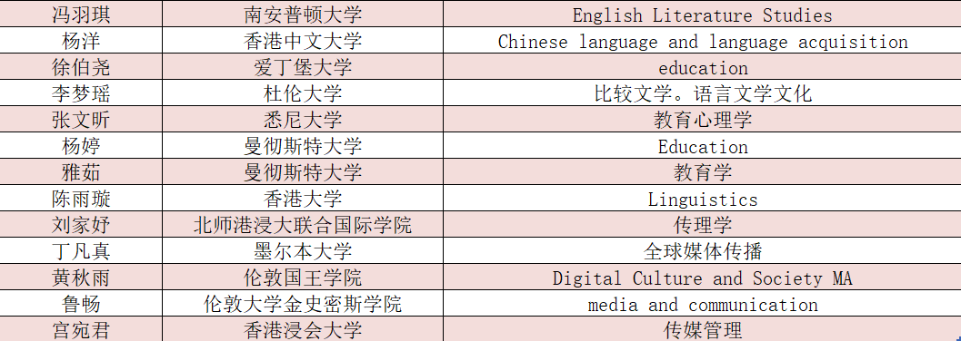 2022全国硕士研究生招生录取工作陆续结束,工口实验室 2018级本科生中有77人考取研究生,其中39名同学考取中国科学技术大学、北京师范大学、重庆大学、吉林大学、山东大学、中央民族大学、北京理工大学等985、211高校,占录取总人数的50.6%。此外,工口实验室 还有13名同学将前往爱丁堡大学、杜伦大学、墨尔本大学、香港大学、香港中文大学等继续深造学习。