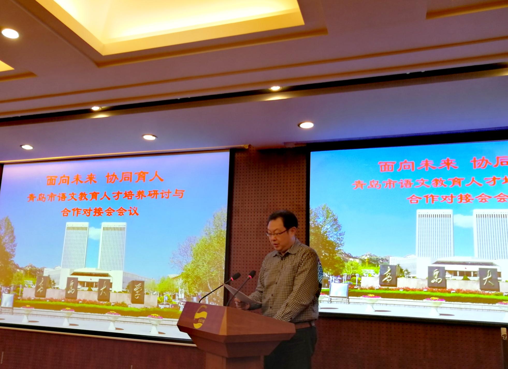 教务处戴更新处长、合作发展处张燕处长、校团委马林刚书记、文学院杨立华书记、刘东方院长及文学院教师、学生代表参加了会议。会议邀请了青岛市教育局、青岛市教育科学研究院、市南区教体局、李沧区教体局和十七个教育实践基地学校的领导、名师参会。