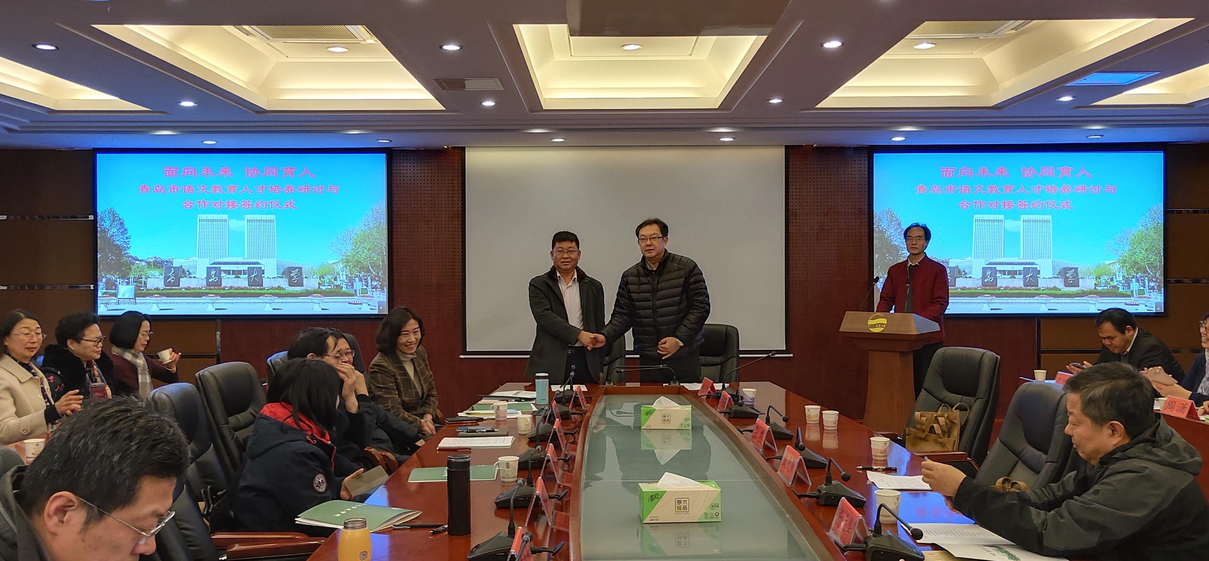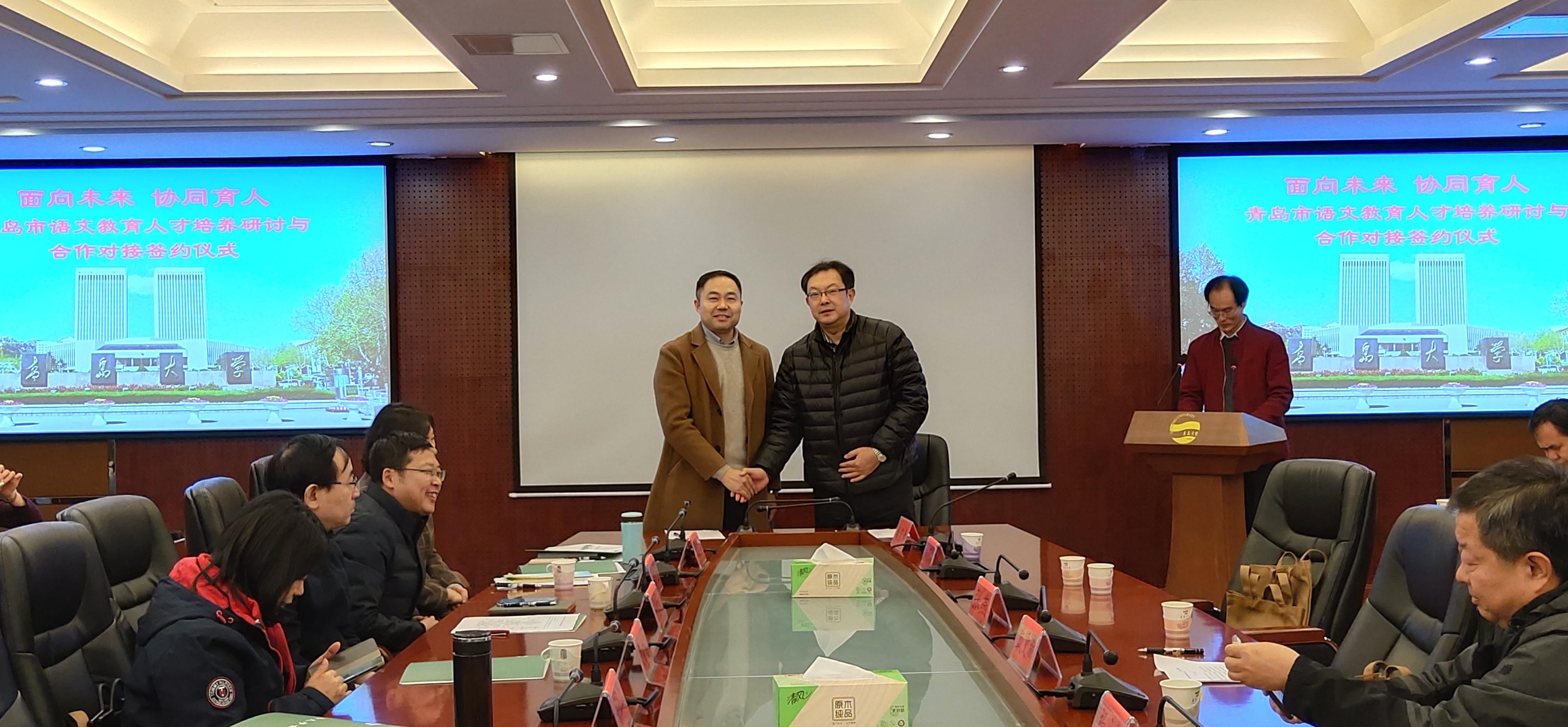 文学院与青岛市、区教育局、中小学三方建立权责明晰、稳定协调、合作共赢的“三位一体”协同培养机制,构建教师培养、培训、研究和服务一体化的合作共同体。