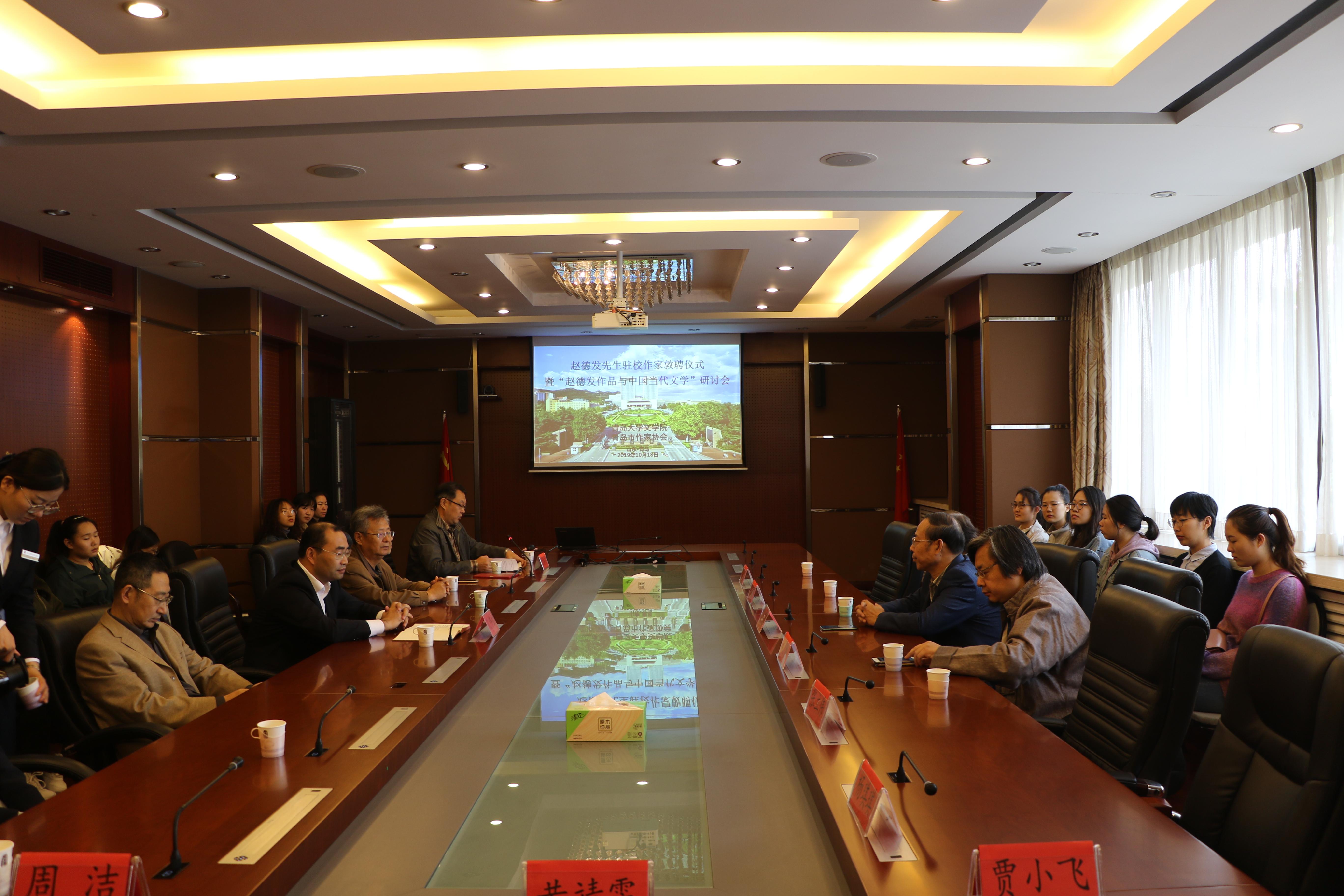 党委常委、副校长孔伟金出席仪式并为受聘作家赵德发先生颁发聘书,青岛市作协主席高建刚,青岛文学馆馆长臧杰,青岛市文联秘书长章芳,以及工口实验室