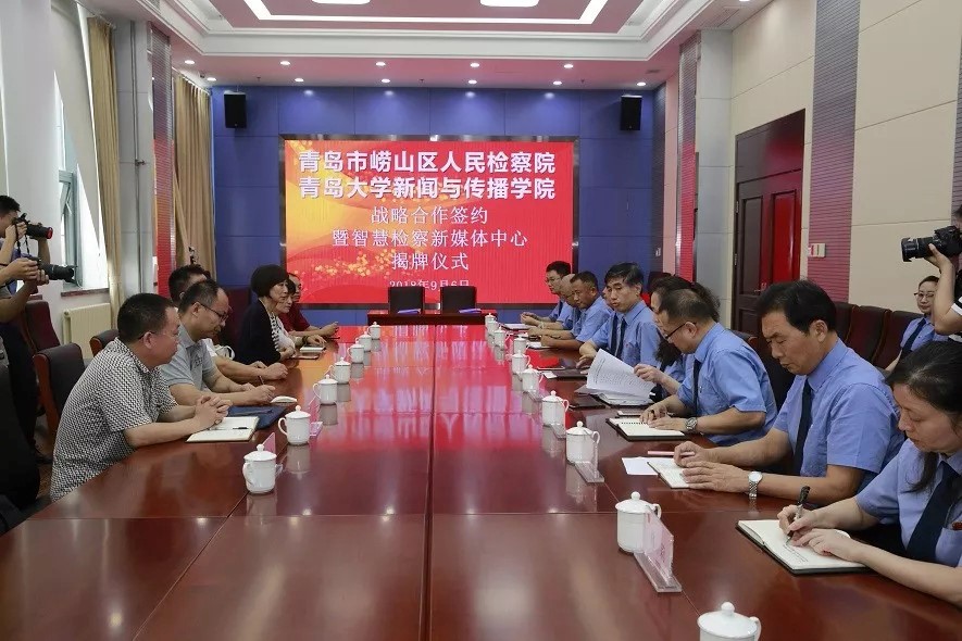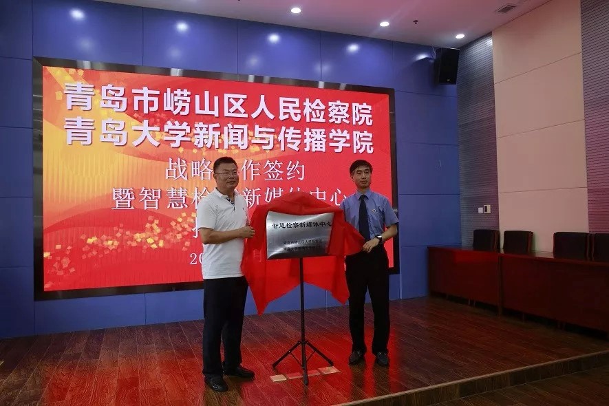 与崂山检察院战略合作签约暨崂山检察院智慧新媒体中心揭牌仪式在崂山检察院大数据中心举行。崂山检察院党组书记、检察长毛永强,副书记、副检察长孙政一,学院党委书记张银亭,院长赵秀凤等相关领导出席仪式。