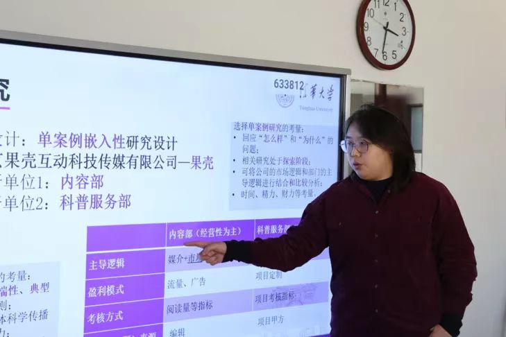 杨婧讲解了《社交媒体科学传播内容生产研究——以果壳为例》,她在研究中提及“社交媒体逻辑究竟如何体现在科学传播内容生产的日常中”这一问题,这一问题的核心就是在技术逻辑层面,包括对数据指标的强调和对算法的习得。第二个层面是社交媒体逻辑的内容逻辑,其中主要分为三个类别,第一是追求好指标的选题,第二是高性价比的选题,第三是迎合社交媒体逻辑的运营方式。最后一个层面是社交媒体的制度逻辑,其有不可见威胁和制度逻辑构成的复杂。