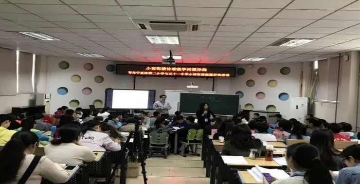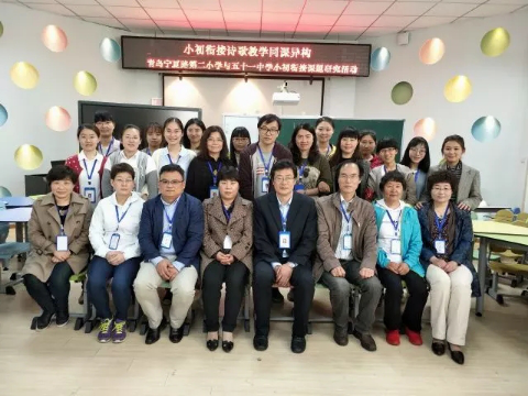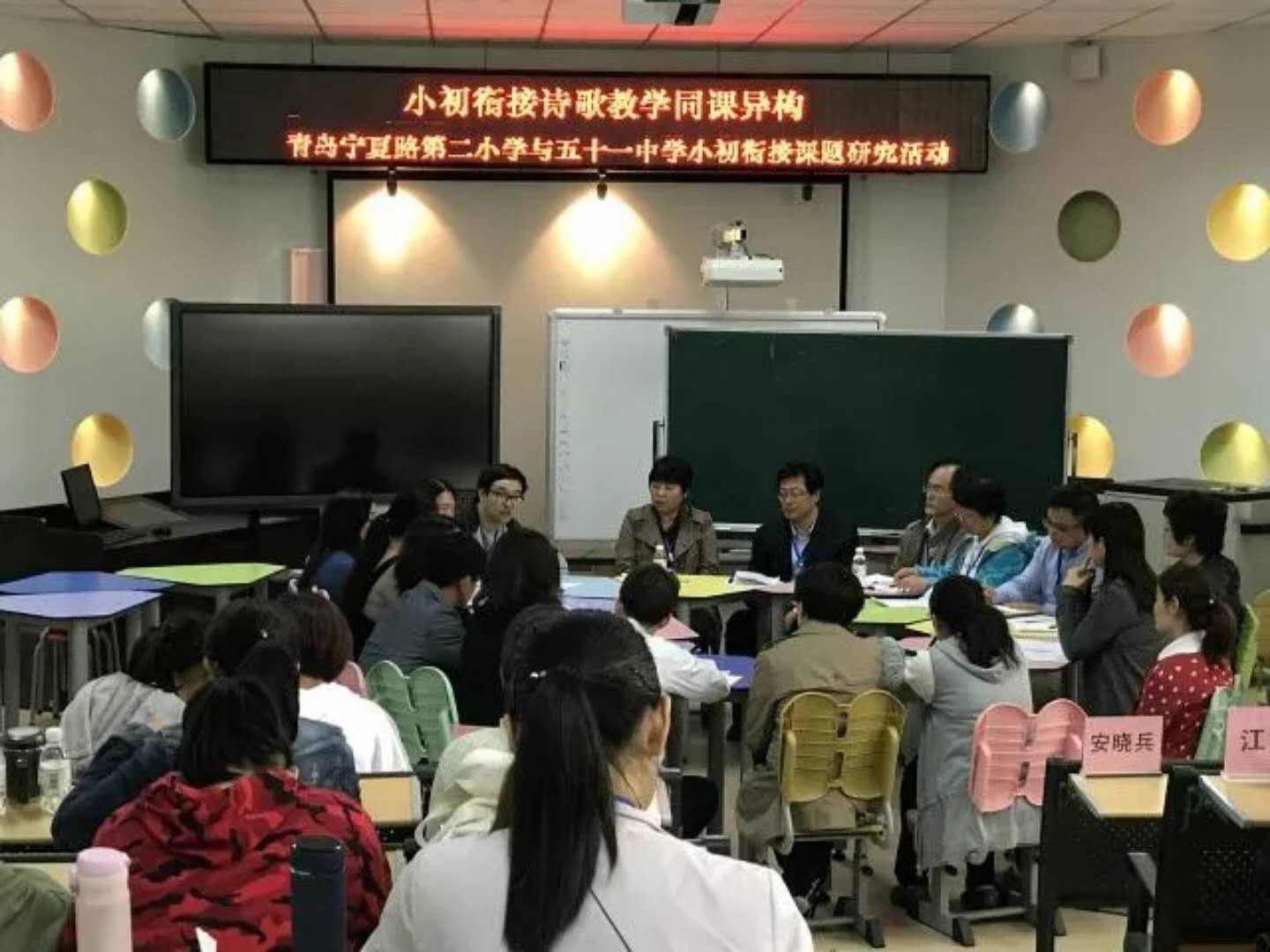 文学院窦秀艳副院长、杨宝春、周潇、杨全红、钱伟、栾贻爱、张晓明7位老师以及学科教学语文专业的研究生一同参加了青岛市宁夏路第二小学举行的“小初衔接诗歌教学同课异构”专题教研活动。参加本次教研活动的还有宁夏路第二小学校领导、语文教研组全体教师,青岛五十一中校领导、七年级语文组部分教师,青岛市市南区东二学区各小学六年级语文教师代表以及宁夏路二小家长代表等50余人。