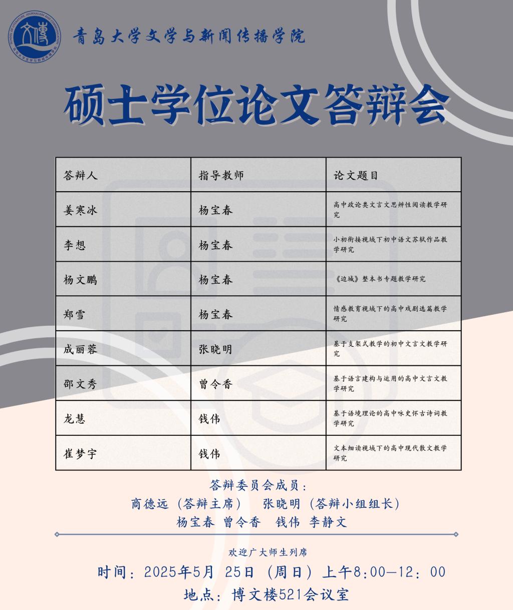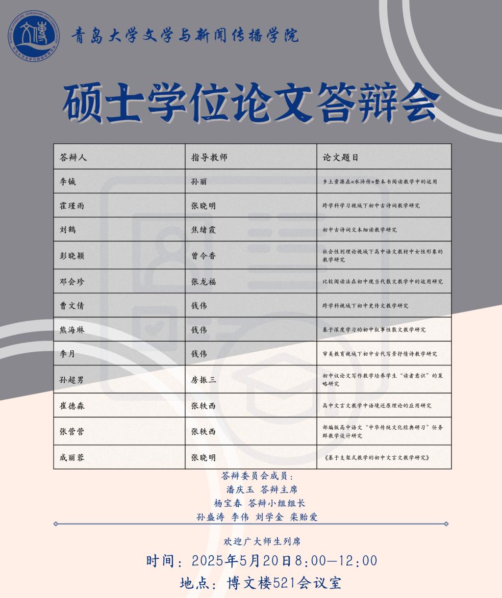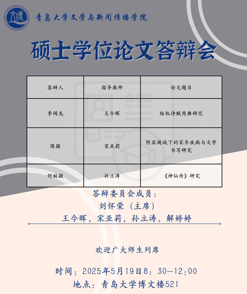 工口实验室 将于5月19日至5月25日进行文艺学、汉语言文字学、中国古典文献学、中国古代文学、中国现当代文学、比较文学与世界文学、新闻与传播、学科语文(全日制)、学科语文(非全日制)、广播电视专业的硕士学位论文答辩,欢迎广大师生列席旁听。具体安排如下: