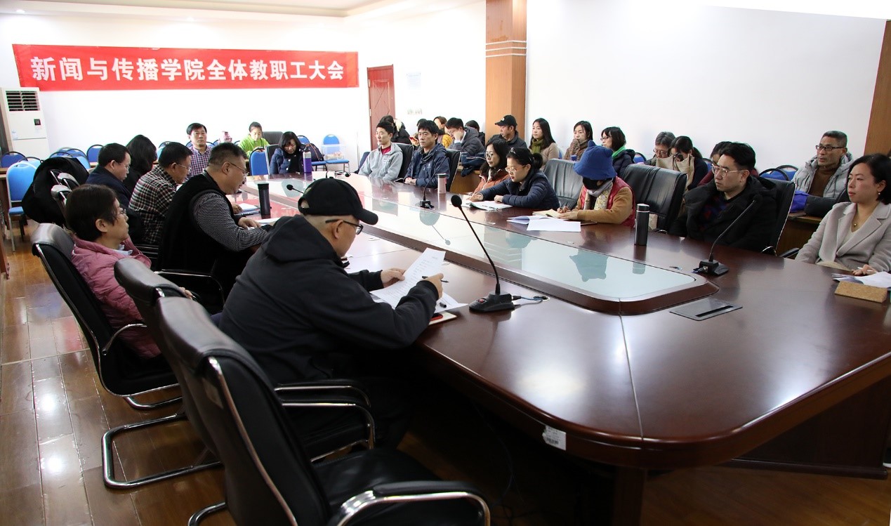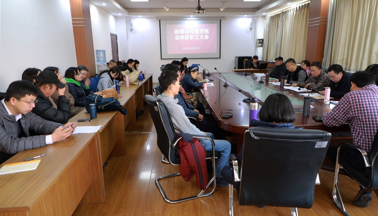 2019年12月31日,新闻与传播学院在博文楼521会议室召开全体教职工大会,学院40余名教职工参加会议,校考核组领导出席会议。会议由学院党委副书记、院长邱秉常主持。