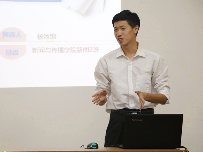 他们都是来自学生会各个部门的优秀成员。在过去的学期中,他们在学生会付出了时间和精力,也锻炼了自己,得到老师、师哥师姐和同伴们的肯定。今天,他们以演讲的形式,总结一学期以来的收获,陈述自己的竞选优势并进行工作展望。新传学院学工办主任王洪运老师、团委副书记杜晓老师以及学院第一届学生会干部到场担任评委。新一届学生会干部名单将在对参加竞选同学进行综合考量之后形成。