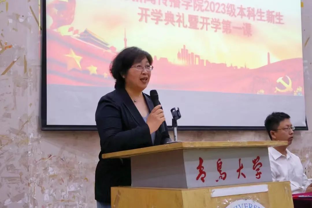 2023级本科生新生开学典礼暨开学第一课在金家岭校区西院图文中心四楼报告厅举行。院党委书记张辉、院长刘东方、院党委副书记戚昕、副院长张文彦、副院长周潇、院长助理耿志宏、院长助理高存玲、中文教育系主任杨宝春、团委老师孙晓萱、辅导员王凤娇、王宁宁以及新生各班班主任出席典礼,2023级全体本科新生参加、