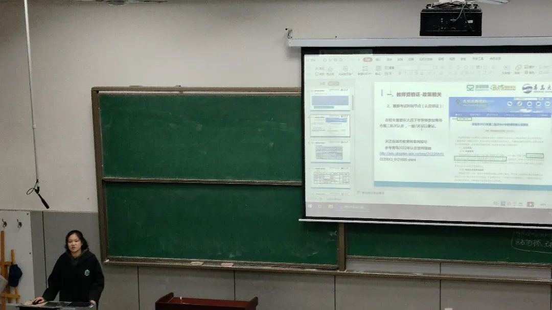 陈怡丹在分享之前先与在座的师范生同学交流了教师资格证的问题,向大家分享了教师编与教招的注意事项,鼓励师范生积极参加师范生技能大赛,为后续选岗积累优势。她还为同学们推荐了多个优秀公众号,强调师范生要重视试课讲课、教姿教态以及对课本与教材的把握等。