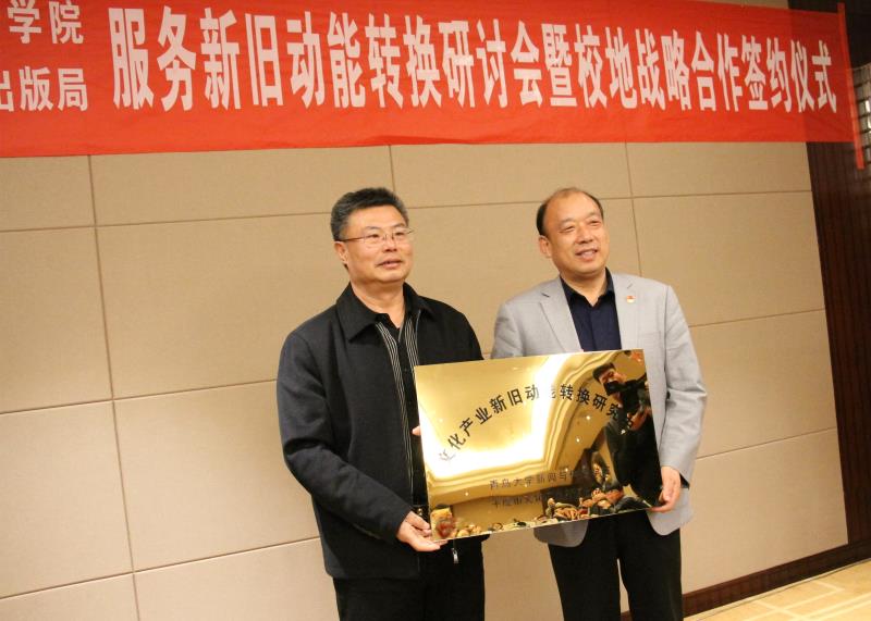 赵秀凤和刘成爱分别代表双方就举行服务新旧动能转换工作研讨暨校地战略合作的缘起、意义和预期目标做了介绍。张银亭和刘成爱共同为双方共建的“文化产业新旧动能转换研究中心”揭牌。会上,新闻与传播学院向平度市的部分艺术家和文化产业研究专家颁发了业界导师聘书。