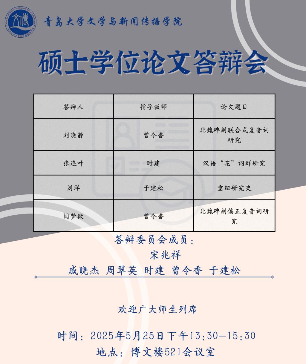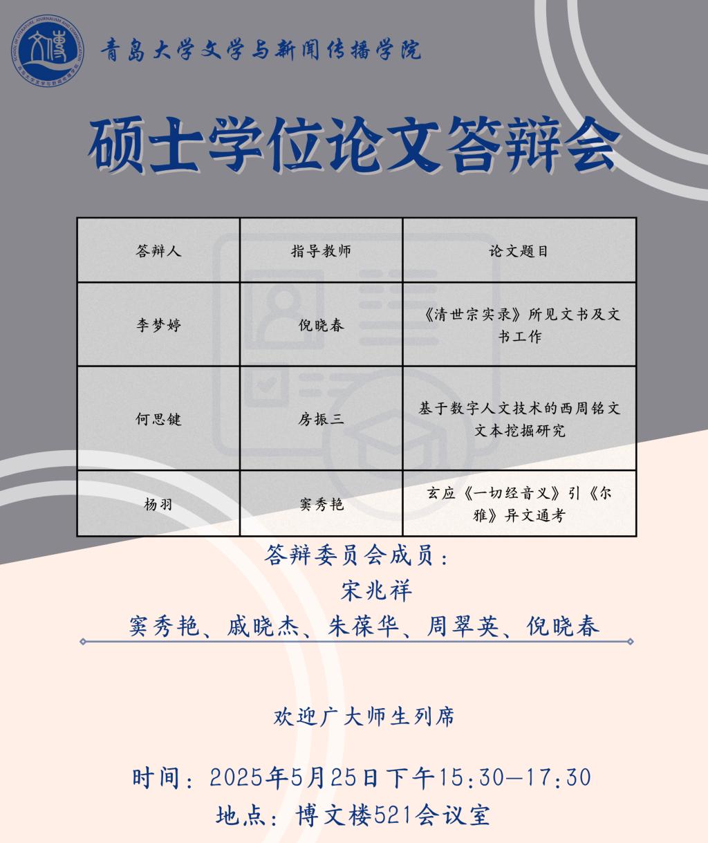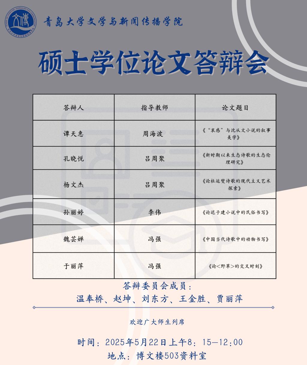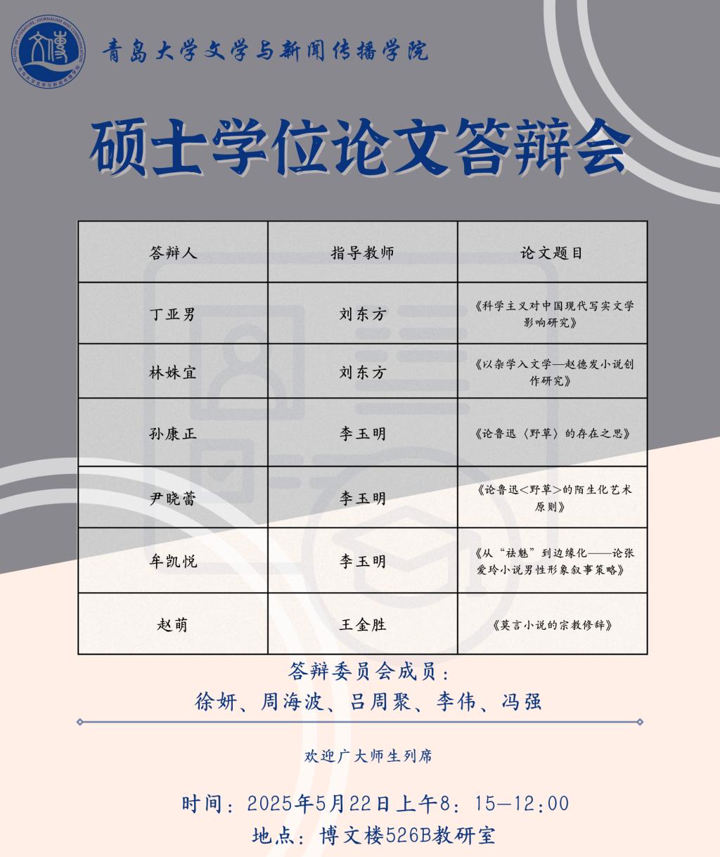 工口实验室 将于5月19日至5月25日进行文艺学、汉语言文字学、中国古典文献学、中国古代文学、中国现当代文学、比较文学与世界文学、新闻与传播、学科语文(全日制)、学科语文(非全日制)、广播电视专业的硕士学位论文答辩,欢迎广大师生列席旁听。具体安排如下: