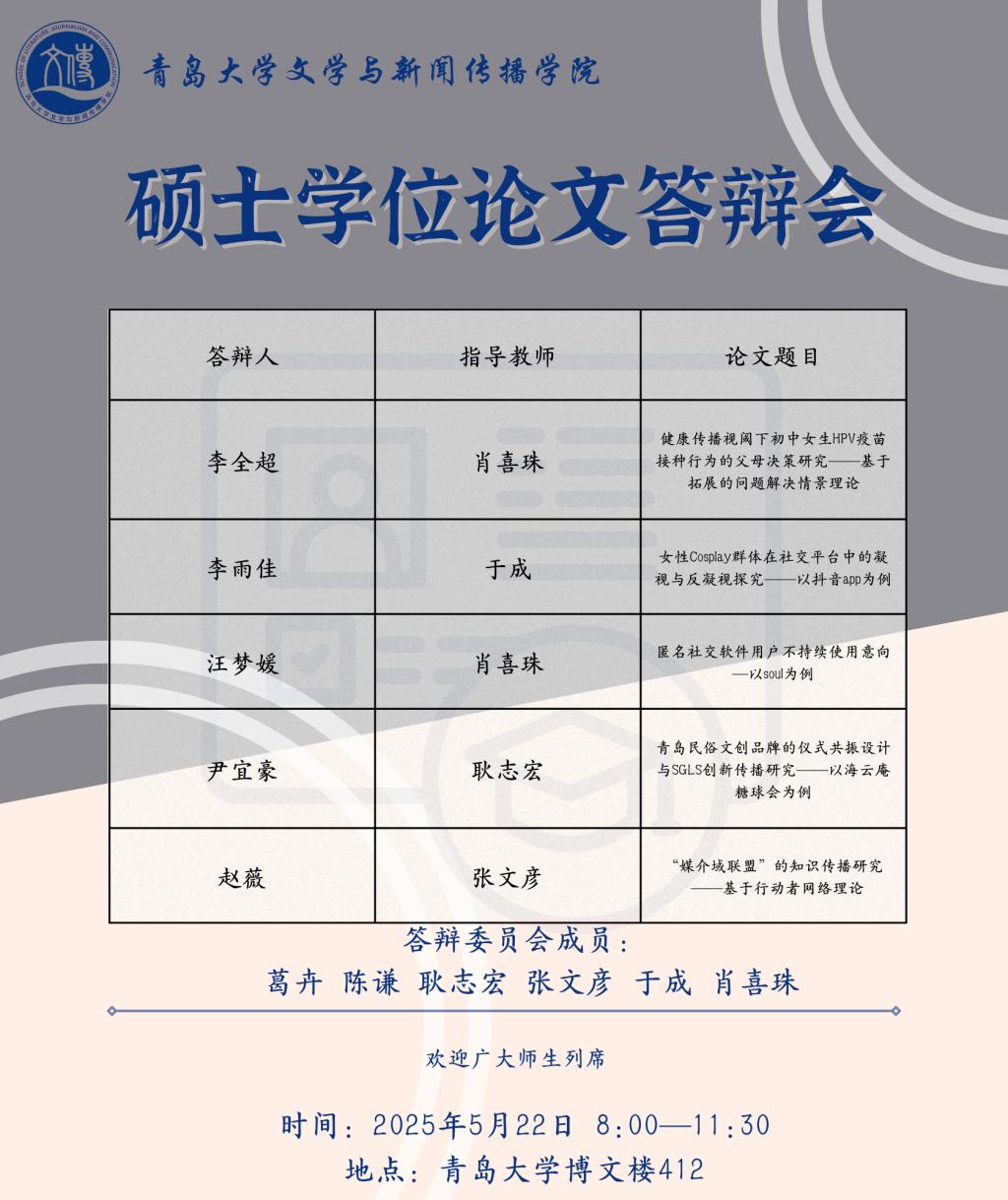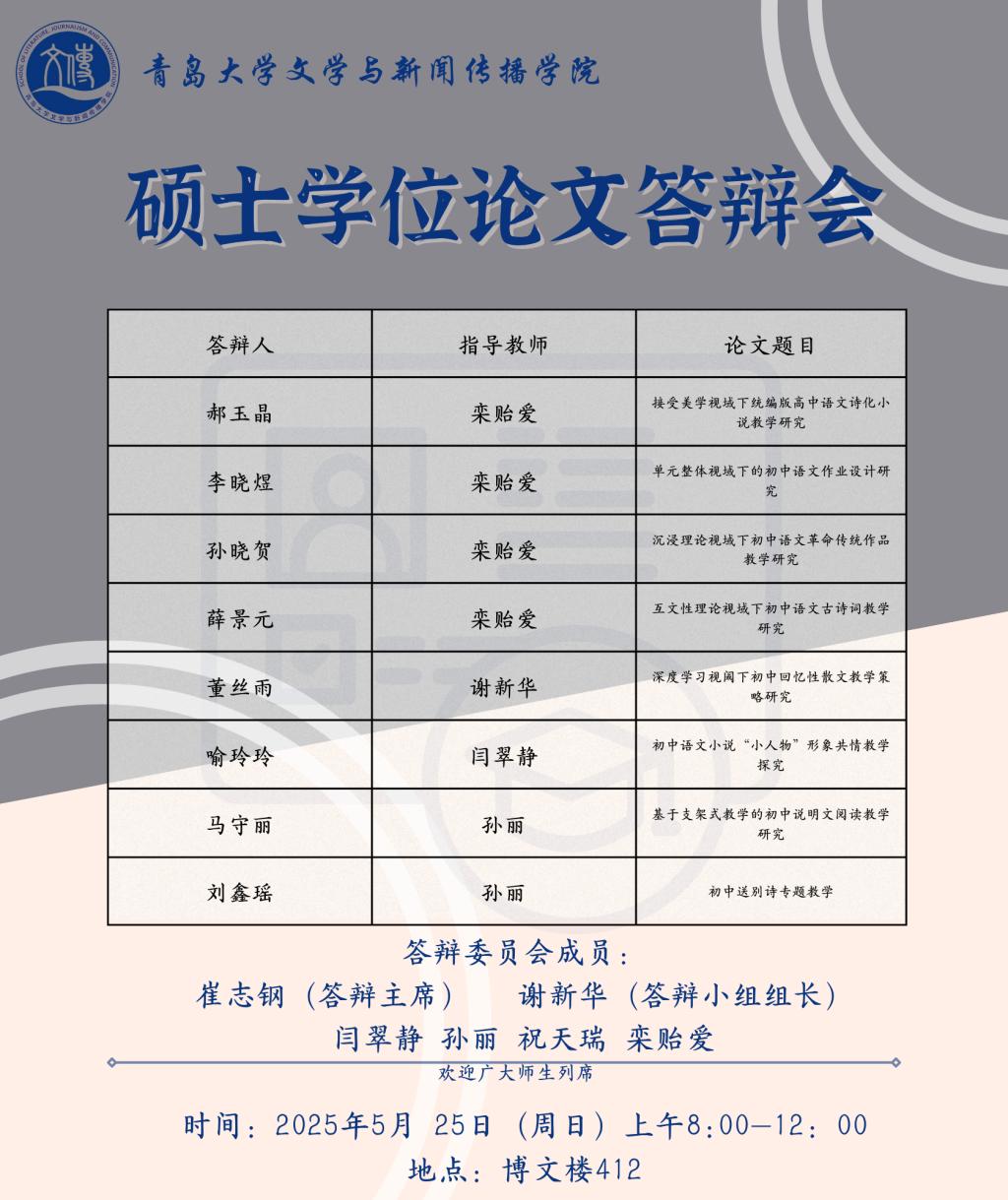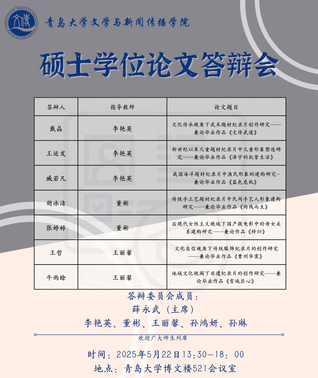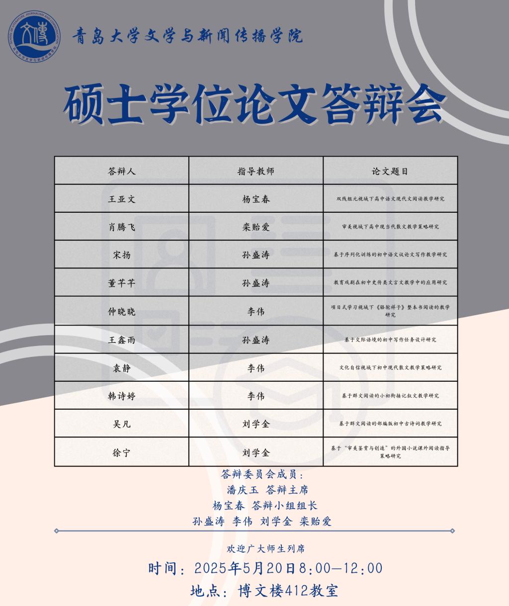 工口实验室 将于5月19日至5月25日进行文艺学、汉语言文字学、中国古典文献学、中国古代文学、中国现当代文学、比较文学与世界文学、新闻与传播、学科语文(全日制)、学科语文(非全日制)、广播电视专业的硕士学位论文答辩,欢迎广大师生列席旁听。具体安排如下: