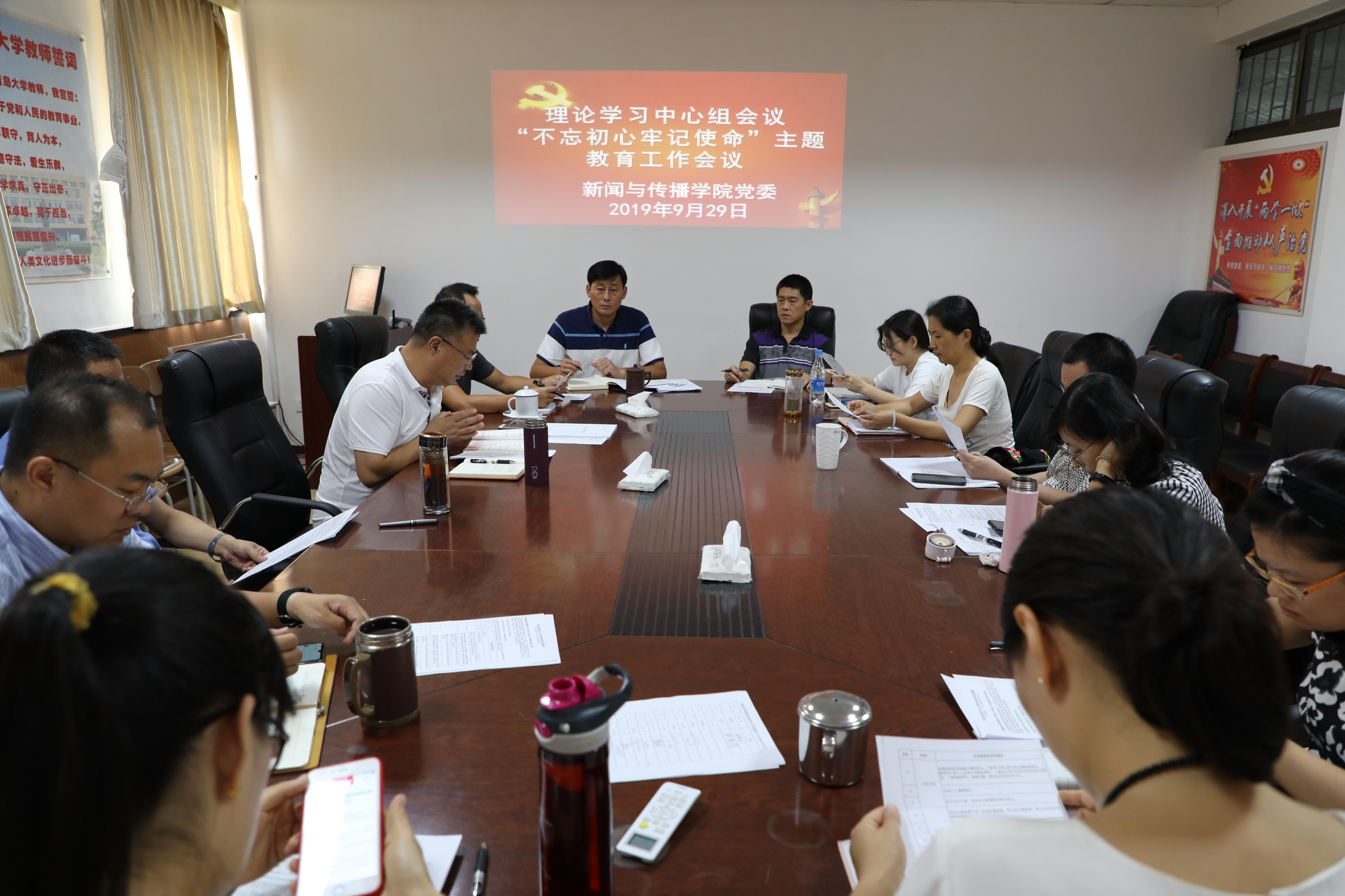 于2019年9月29日在博文楼412会议室召开新闻与传播学院理论中心组学习会议,学院党委书记张银亭主持会议并发表动员讲话,对学院的主题教育工作进行部署。