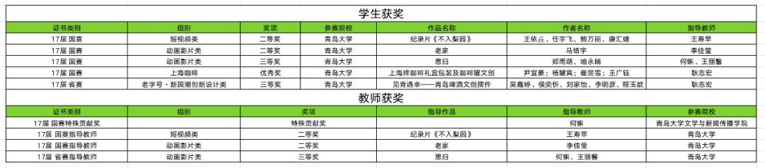 学生马靖宇的作品纪录片《老家》在荣获国家级二等奖,郑雨萌、喻永晴的作品《思归》荣获国家级三等奖,王依垚团队的作品《不入梨园》荣获国家级二等奖,尹宜豪团队的作品《上海牌咖啡礼盒包装及咖啡罐文创》荣获国家级优秀奖,吴鑫婷团队的作品《见青遇幸——青岛啤酒文创摆件》荣获省级三等奖。