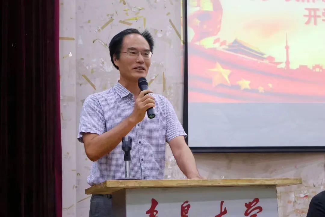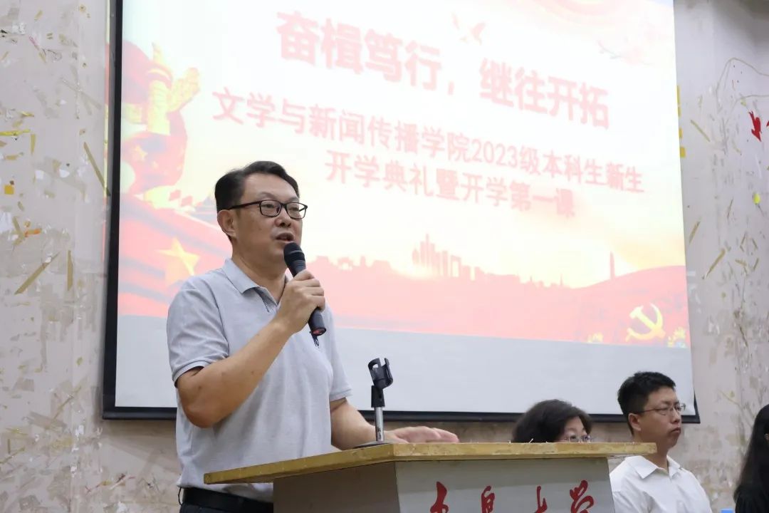 杨宝春作为教师代表进行了讲话。他从目标、行动、成就三个方面为同学们进行了指导发言,表示希望同学们在此金秋九月带着希望与目标来到文传学院,成就更好的自己。他还提到,大家应该思考如何度过大学四年,关注自我成长,培养前行动力,善于与人沟通交流,书写更加美好的未来画卷。